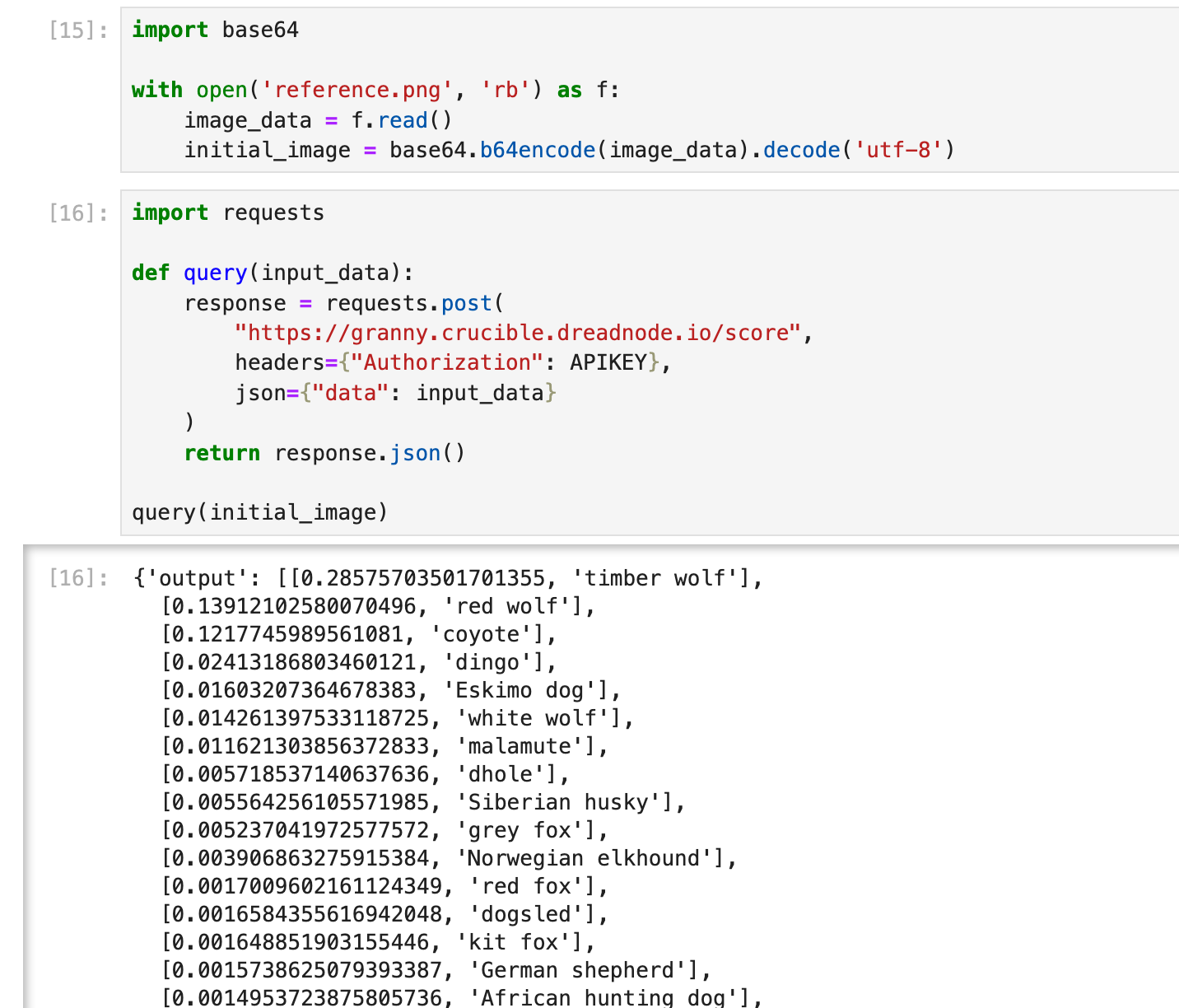 We don't have complete access to the model (gradient access), but the API responds with complete numerical outputs. Since we have the Labels: [timber wolf, red wolf, coyote, dingo] and the Scores: [0.285, 0.139, 0.121, 0.024] we have enough information to perform "gray-box" attacks to estimate the gradients from the scores.