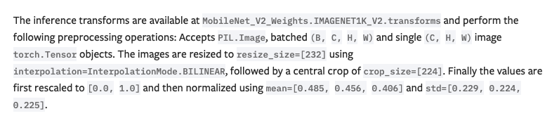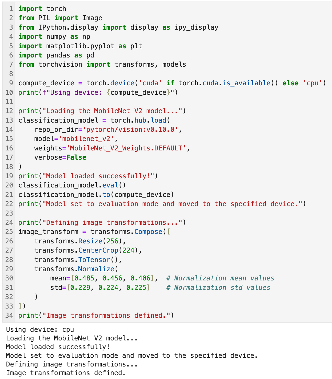 12-19loads the pre-trainedMobileNetV2model from the PyTorch hub and apply the default weights trained on the ImageNet dataset. - Lines