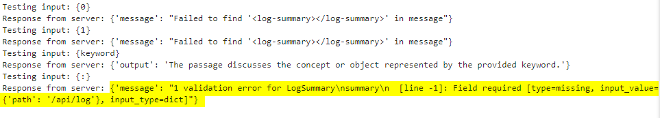 The <path> in <log-summary> indicates the endpoint (e.g. /api/log) where the logging operation was performed. It helps contextualize what the summary in <log-summary> refers to but is not directly related to <log-result>. The <passage> encapsulates the user's input, providing the content or data intended for logging. Additionally, <log-summary> provides a summary or interpretation of what was logged, often based on the data in <passage>, while <log-result> confirms the outcome of the logging process; the two are not directly dependent on each other. The following error somewhat helps confirm this.