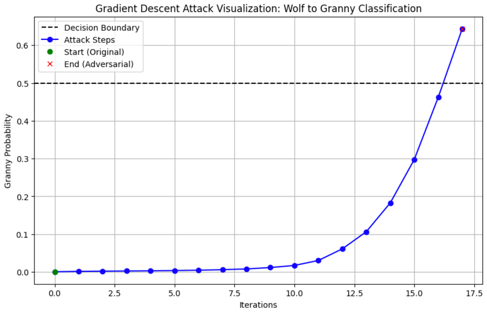 - Decision Boundary: This is an imaginary line that separates all possible model inputs into two distinct classes. Our goal will be to make some small changes (perturbations) to the image which will cause it to cross this boundary, and change its classification.