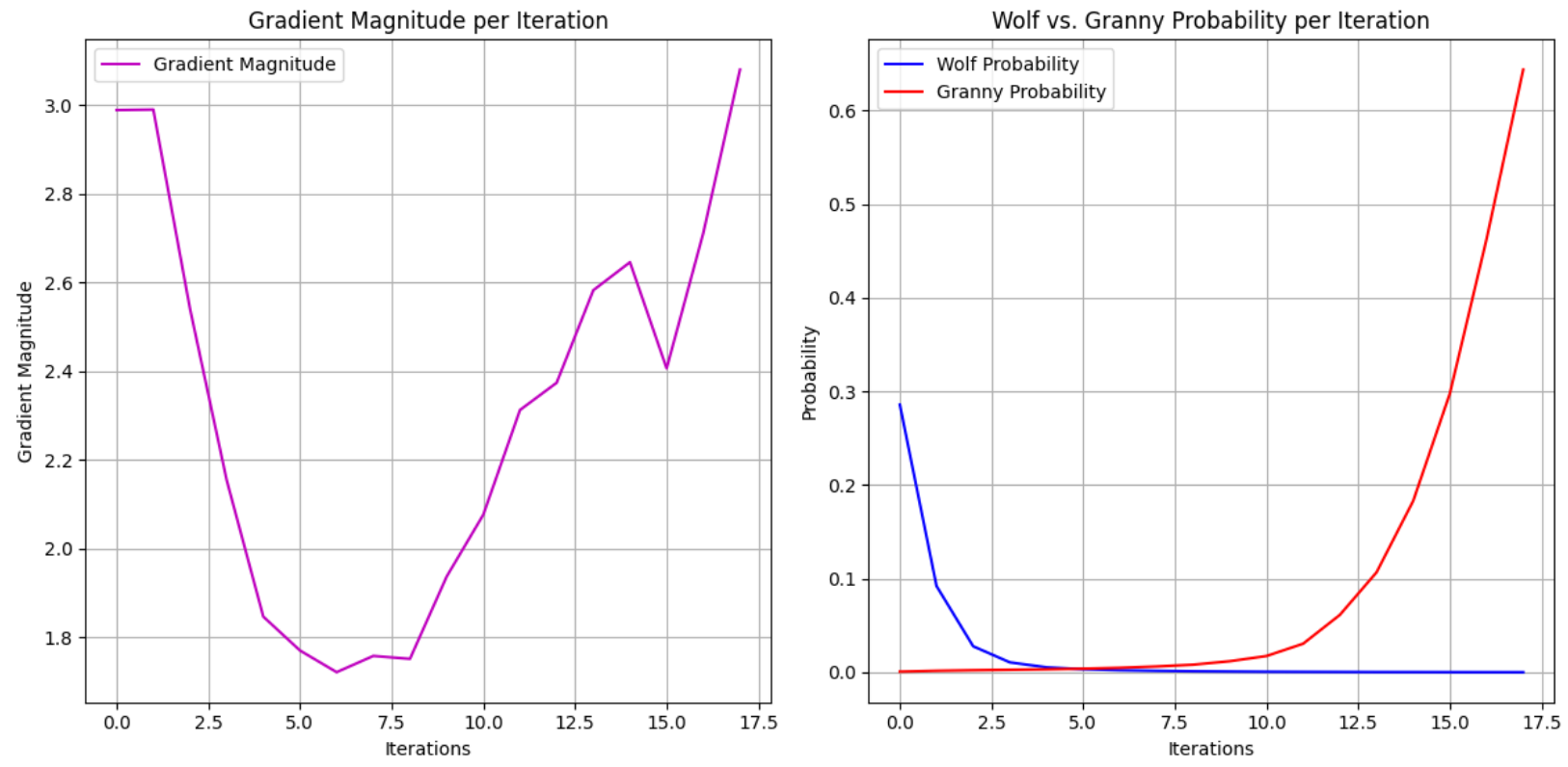 Remember, (broken record) by minimizing the loss, we are simultaneously reducing the score f(x)wolf while increasing f(x)granny and after enough (~18 in our case) iterations, f(x)wolf can become extremely small (effectively zero in terms of probabilities after applying softmax).