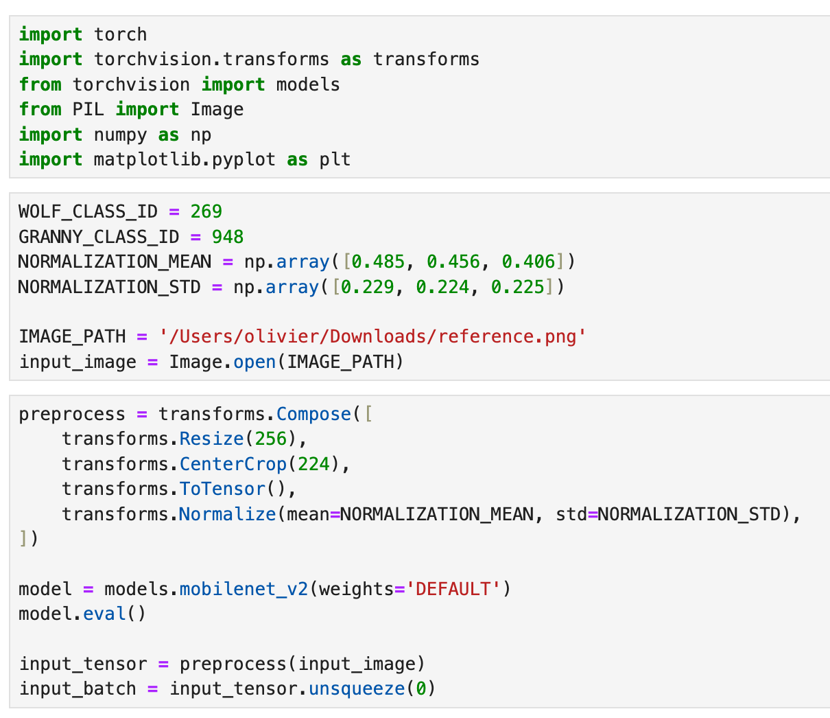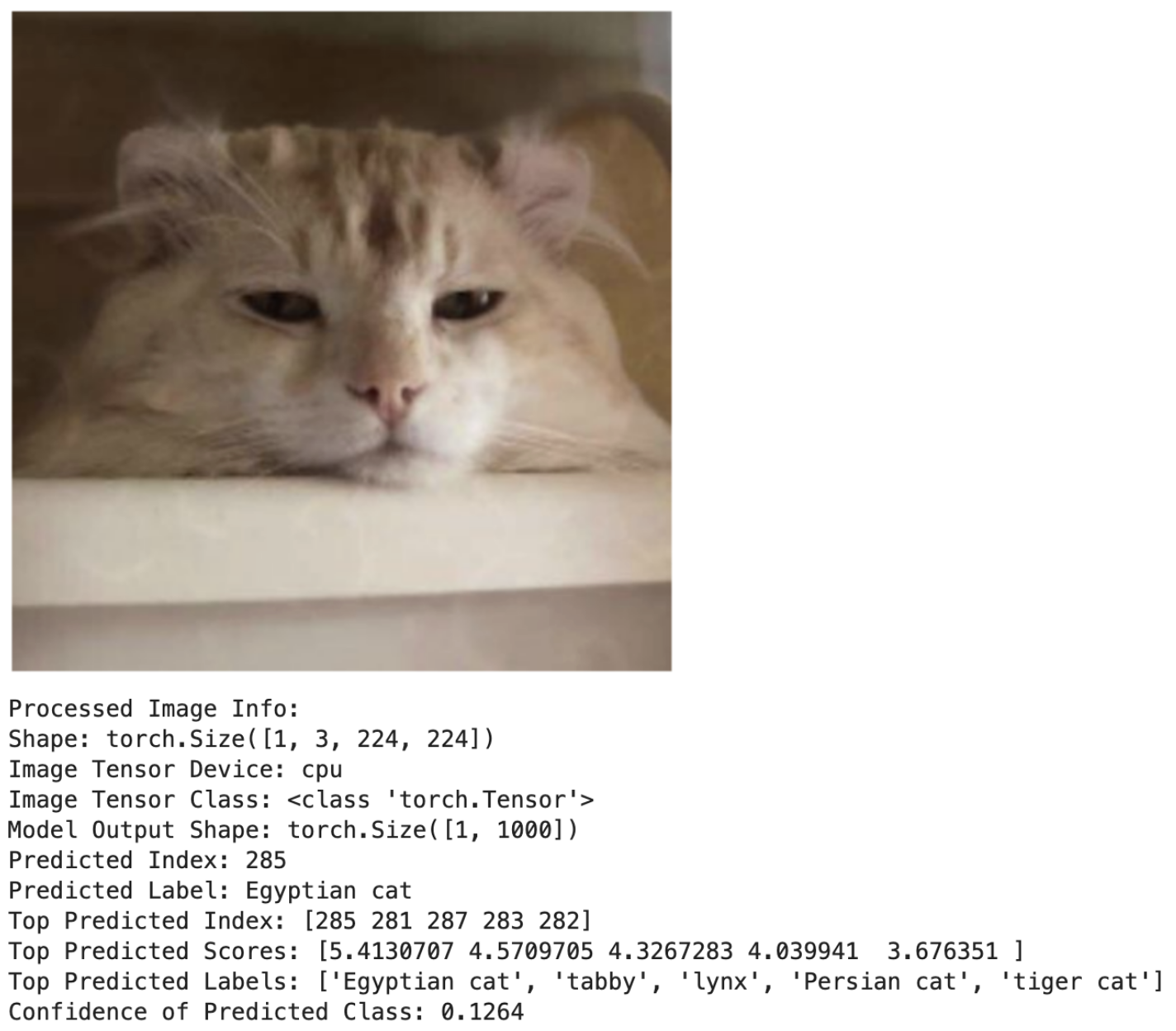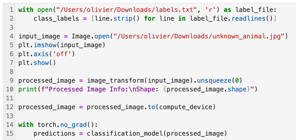 9-10applies the preprocessing pipeline that we just defined above. At this point the image gets resized, cropped it to 224x224 pixels, converted into a tensor, and normalized pixel values using the ImageNet mean & std. - Line