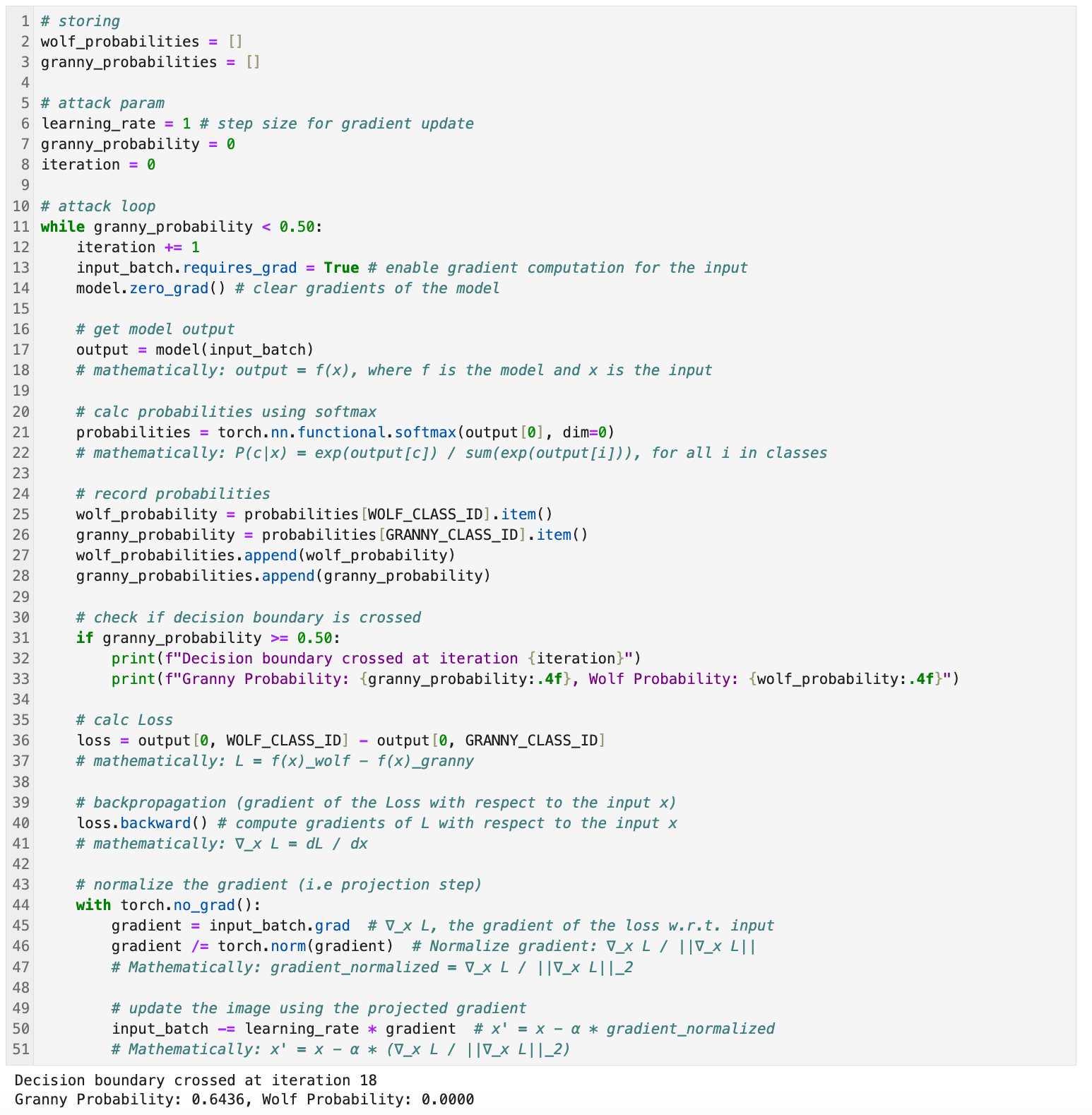 I solved it by performing a projected gradient descent (PGD) attack. To pull this off all we're doing is gradually adjusting the input image in each step to push it across the decision boundary until we classify the Timber Wolf as Granny Smith Apple.