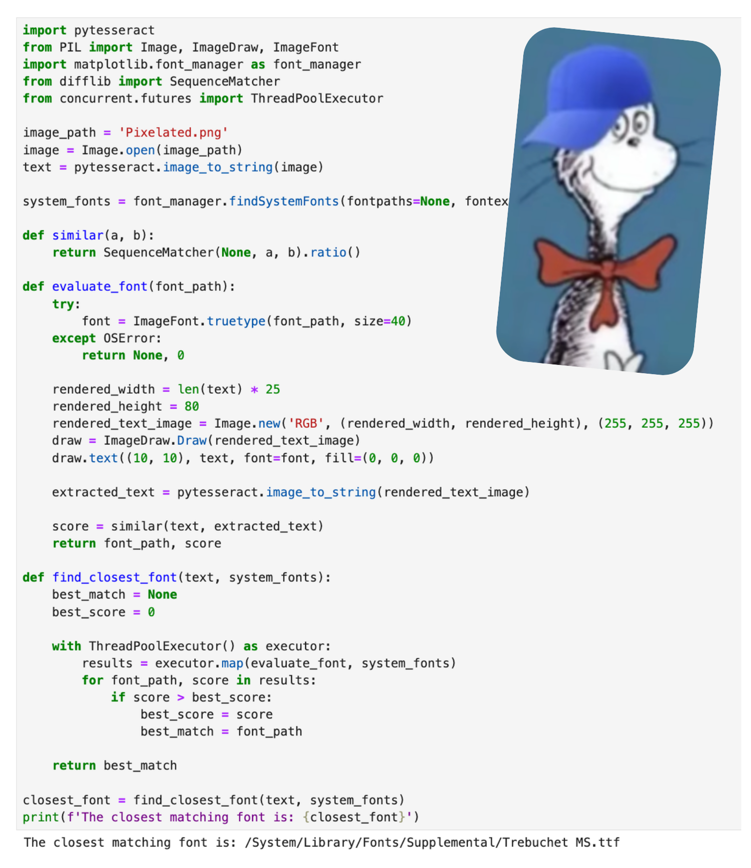 They might not all be OCR-friendly. We'll cross that bridge when we get there. For now, let's find the closest match to Pixelated.png. I won't 🧢, I asked ChatGPT to do this because I'm too stupid to properly optimize.