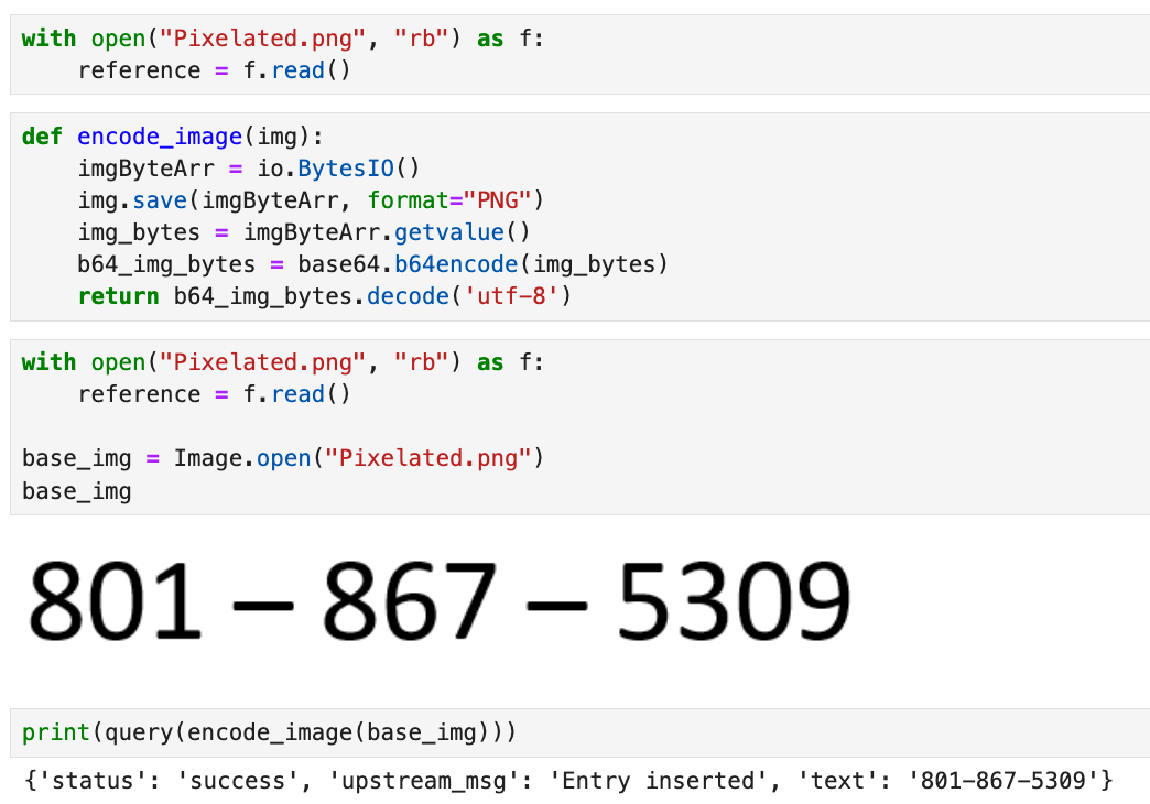 To send our images off for classification we first need to convert the image into binary data, then encode it in base64, and finally convert the encoded data into a UTF-8 string. This format is required for the API to process our image data. We obtain the following response once we send the encoded string to the challenge endpoint.