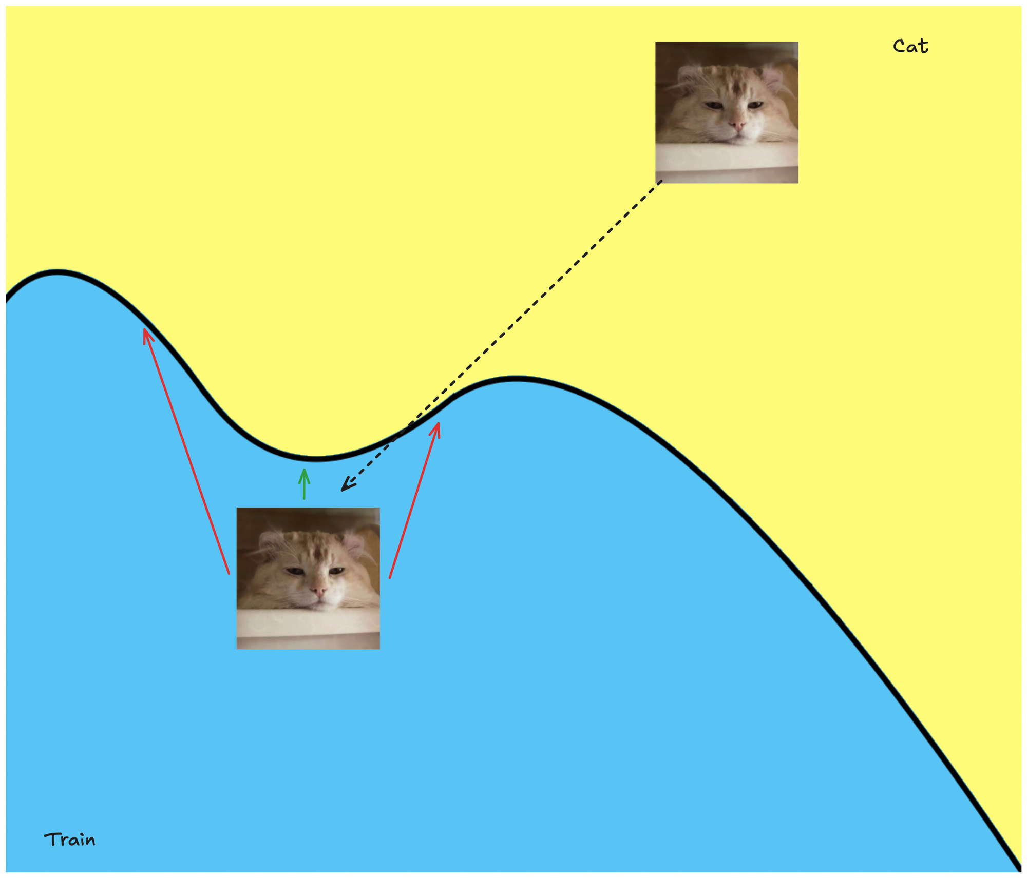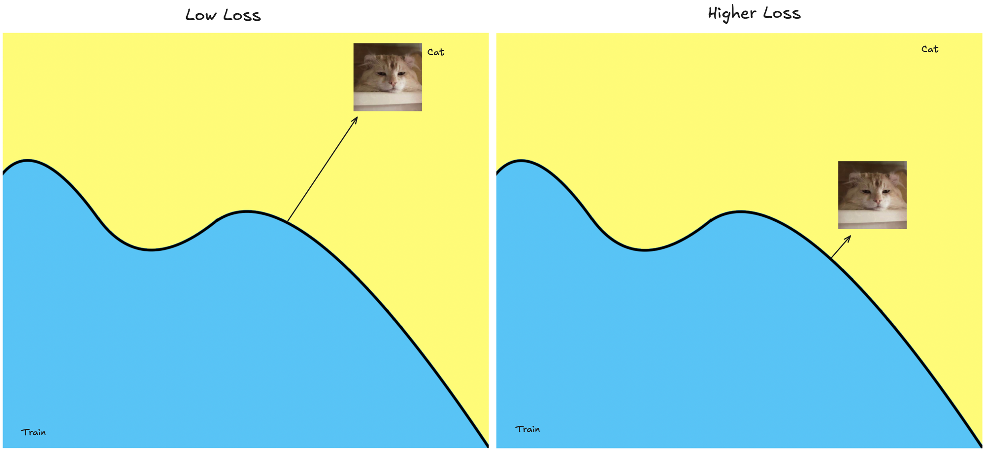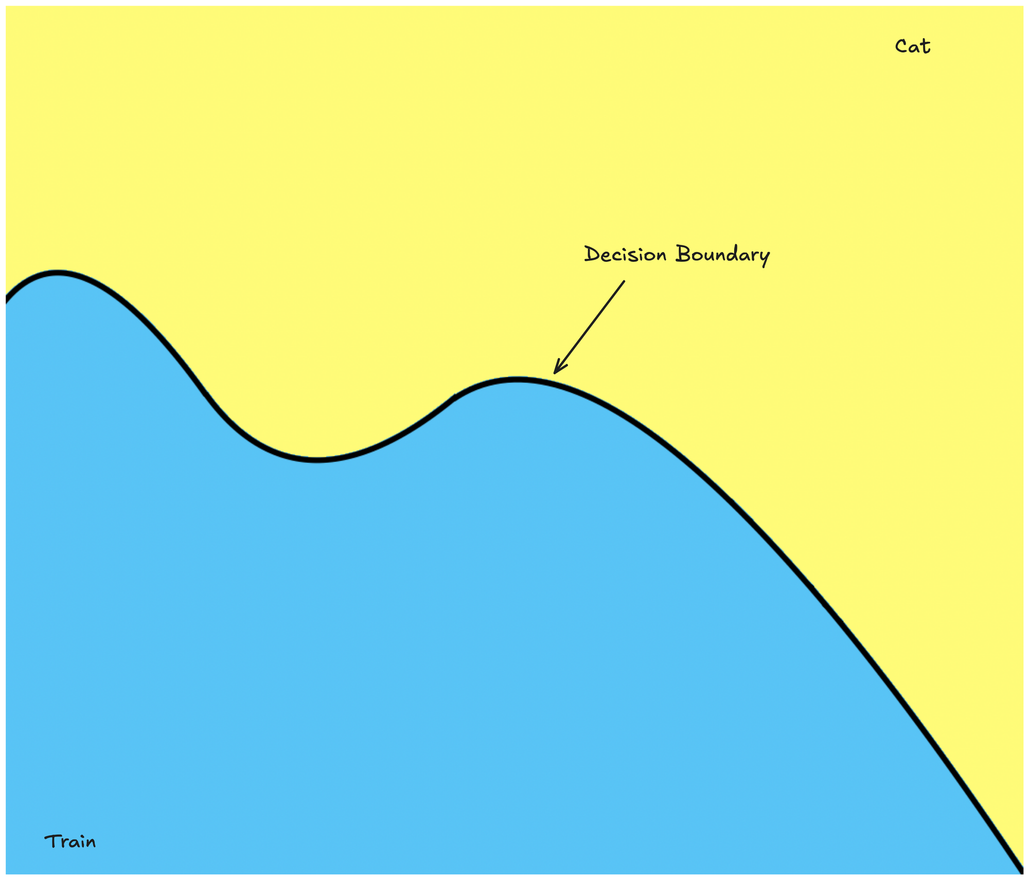 Let's visualize this. Landing in yellow → classified as a cat & landing in blue → classified as a train.