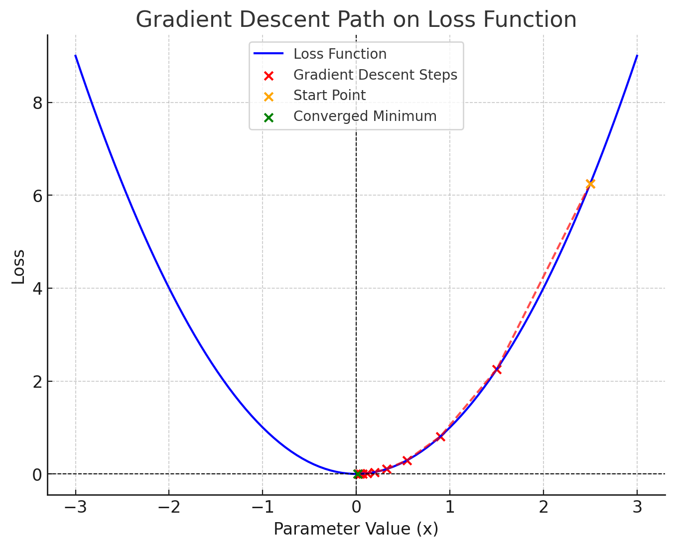 The blue curve represents our loss function y=x^2. The red dots are the steps of gradient descent, this is how the changes to the image are made iteratively. The orange dot is the starting point (x=2.5), where the process begins. The green dot is the converged minimum (x≈0x), where the gradient is zero. Lastly, the red line is the path taken by gradient descent to minimize the loss function.