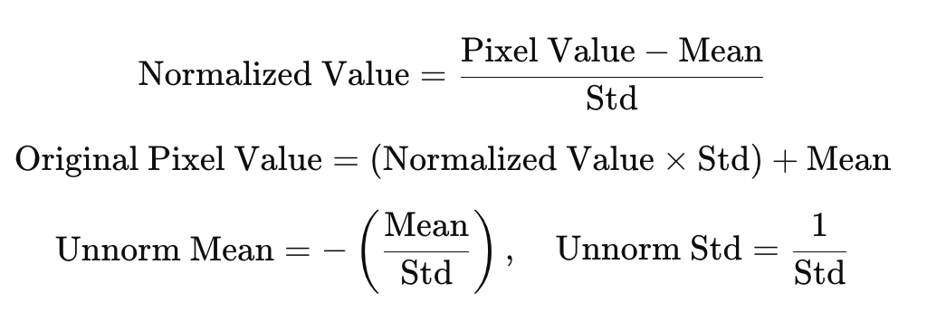 This operation adjusts pixel values with the following equation: Normalized Value =(Pixel Value−Mean)/Std therefore to reverse this normalization (unnormalizing is the reverse) you'd perform the following: Original Pixel Value=(Normalized Value×Std)+Mean