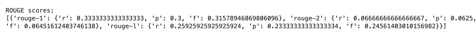 r = recall→ % of words in the reference summary are also present in your generated summary.p = precision→ % of the words in your generated summary are also in the reference summary.f = F1-Score→ % that combines precision and recall, indicating a moderate level of word overlap between the two summaries.