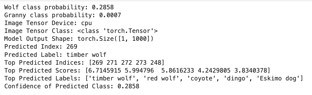 If you're looking at the output & wondering why the Timber Wolf probability is zero, I have failed you. Having it hit 0 is kind of the point. This is in essence the model's vulnerability to adversarial perturbations.