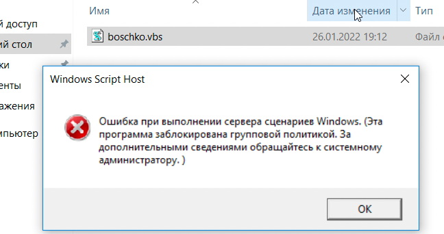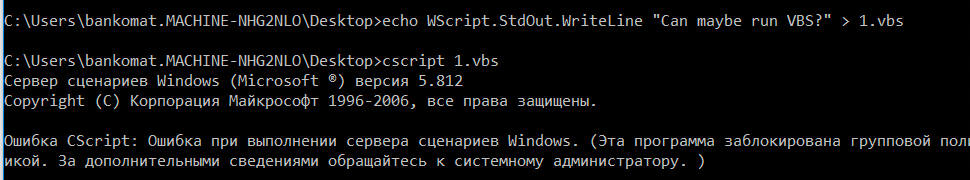 What happens if we run a visual basic script. Obviously, you'll get the following error "An error occurred while executing Windows Script Host. (This program has been blocked by Group Policy. Contact your system administrator for more information.)"