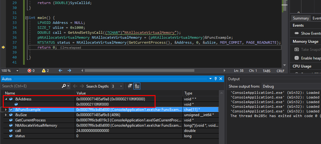 DOUBLE call = GetAndSetSysCall((TCHAR*)"NtAllocateVirtualMemory");