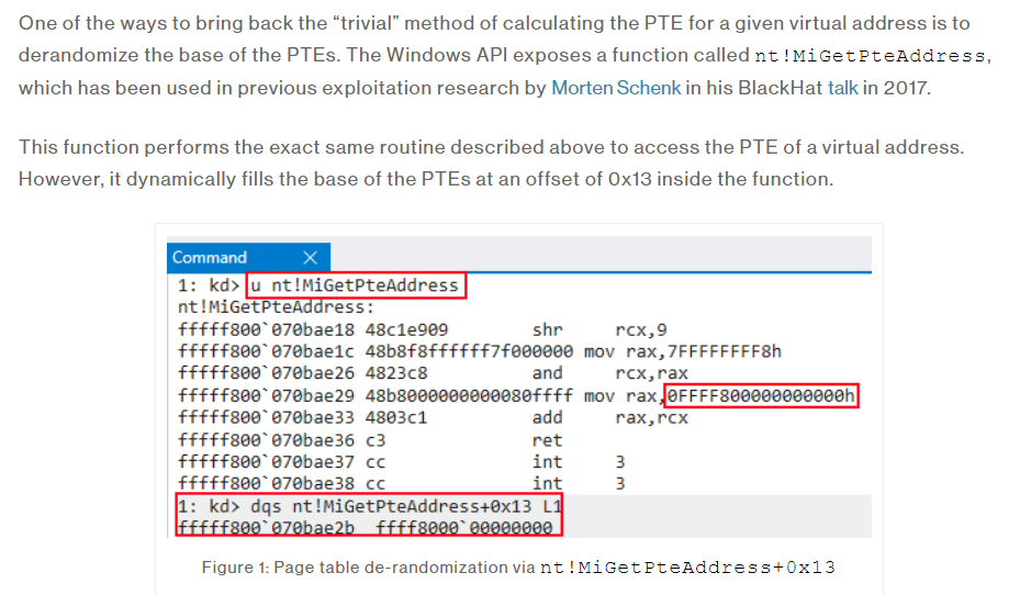 It is well known that different system versions have different system call numbers that enter the kernel. Before manually rewriting functions, it was inevitable to hard-code the call numbers. The technique I'm going to show you is inspired by a blog written by the guys over at crowdstrike. The part entitled "Modern Mitigation #1: Page Table Randomization" kinda ruined what I had planned for the night is shown below.