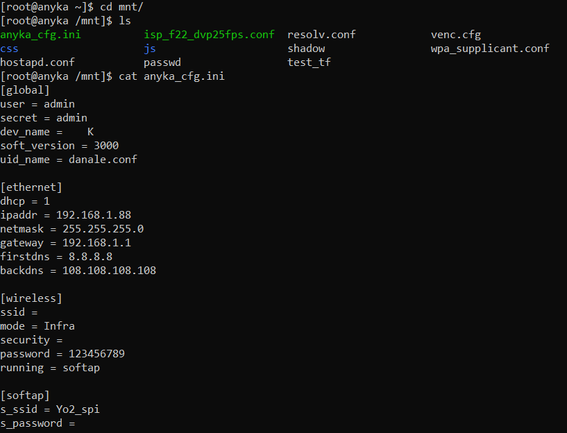 When I was checking out the webroot there were two files I wasn't able to view because of the permissions they were assigned. Now that we have a shell let's look at isp_f22_dvp25fps.conf and anyka_cfg.ini.