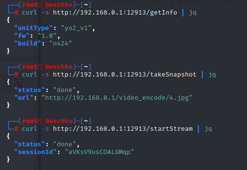 The /startRecord endpoint turns the camera on for ~10 minutes or until /stopRecord is sent. Once stopped it will drop a recording .mp4 into the webroot in the directories created by the service.sh mentioned above. These videos are listed in /getClips. /takeSnapshot takes a picture of whatever the camera see's and stores it in the /video_encode/ located in the webroot.