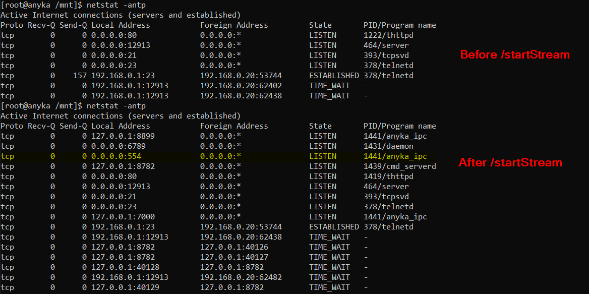 Once the /startStream and /startRecord start if we look at a netstat we'll see that we've got new daemons running.