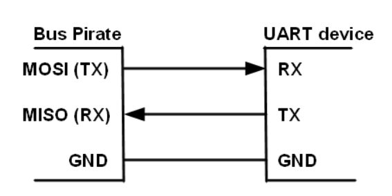 The receiver and transmitter marked RX and TX respectively, need to connect to a second respective UART device’s TX and RX in order to establish communications. In our case, the Bus Pirate will be able to do this.