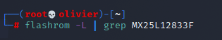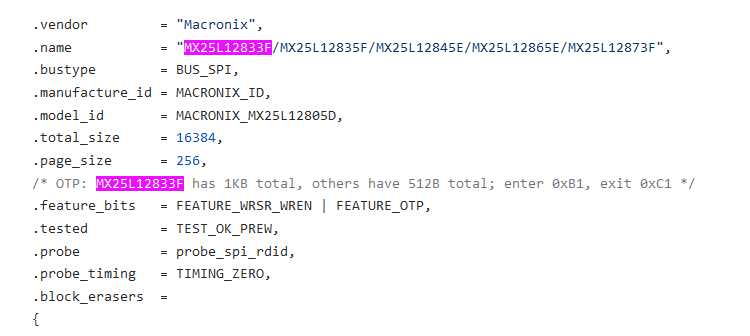 However, after looking at the flashrom source I discovered our chip, the MX25L12833F was only added in the most recent commit to flashchips.c but it seems to just be an alias for an existing entry. So an older version of flashrom should have worked. Regardless, it should've found something and it didn't. There is also an open issue regarding this which can be viewed here.