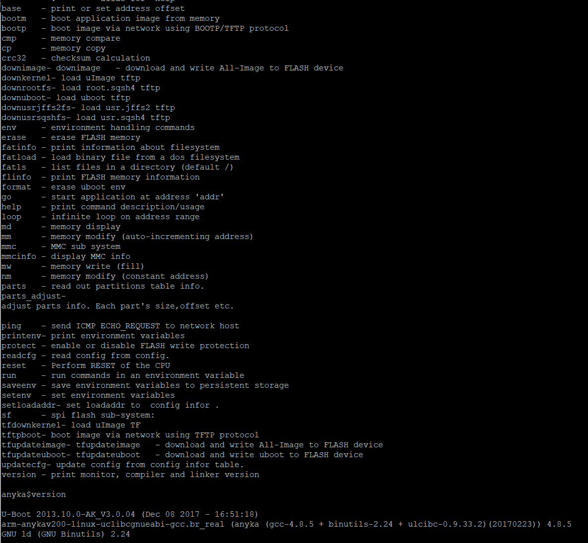 Again, our goal here is to recover the firmware. The number of commands supported in U-Boot varies from device to device, but most low-cost DVRs (Digital video recorders) will have a fairly comprehensive list. Unfortunately (for us), U-boot is mostly concerned with copying data onto the SPI flash, whereas we want to copy data from the SPI flash.