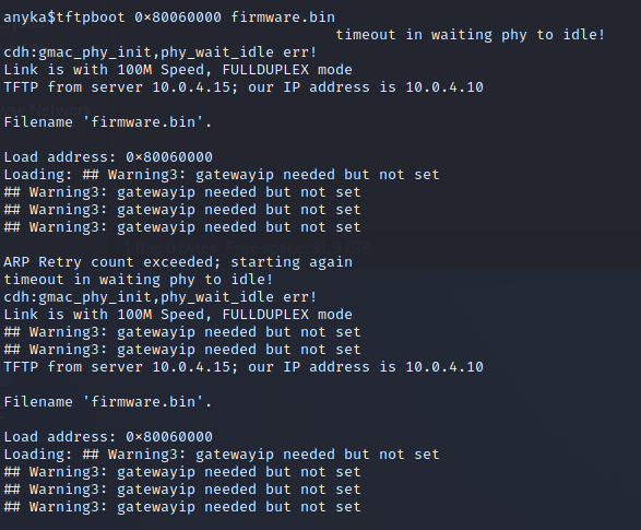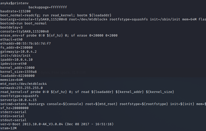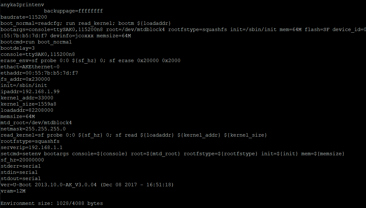 We'll attempt to dump the memory over TFTP. Here's how we'll do it: Since U-boot stores it's settings in something called "environment variables". If you run printenv you'll get its contents, which are as follows.