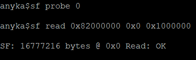 Then we need to copy the flash into RAM. A suitable address in RAM is nearly always 0x82000000. The following command copies 0x1000000 bytes from address 0x0 of the flash into RAM. sf read 0x82000000 0x0 0x1000000
