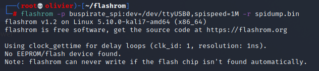 Everything looks fine we can see the serial COM of the BusPirate. In theory we should be able to use flashrom which is a utility for identifying, reading, writing, verifying, and erasing flash chips to dump the firmware.