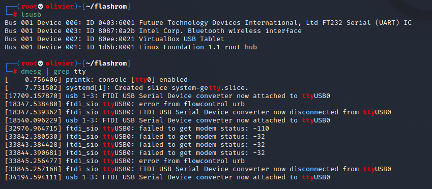 To check what port the bus pirate is connected to we will simply dmesg | tail and lsusb just to make sure everything is in order.