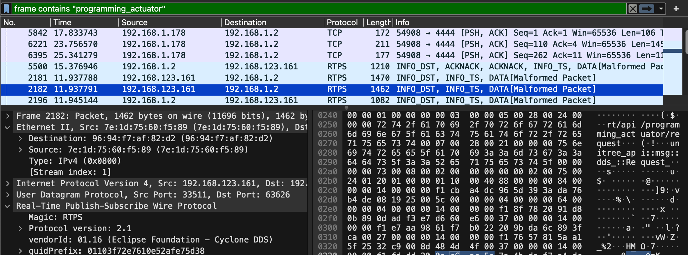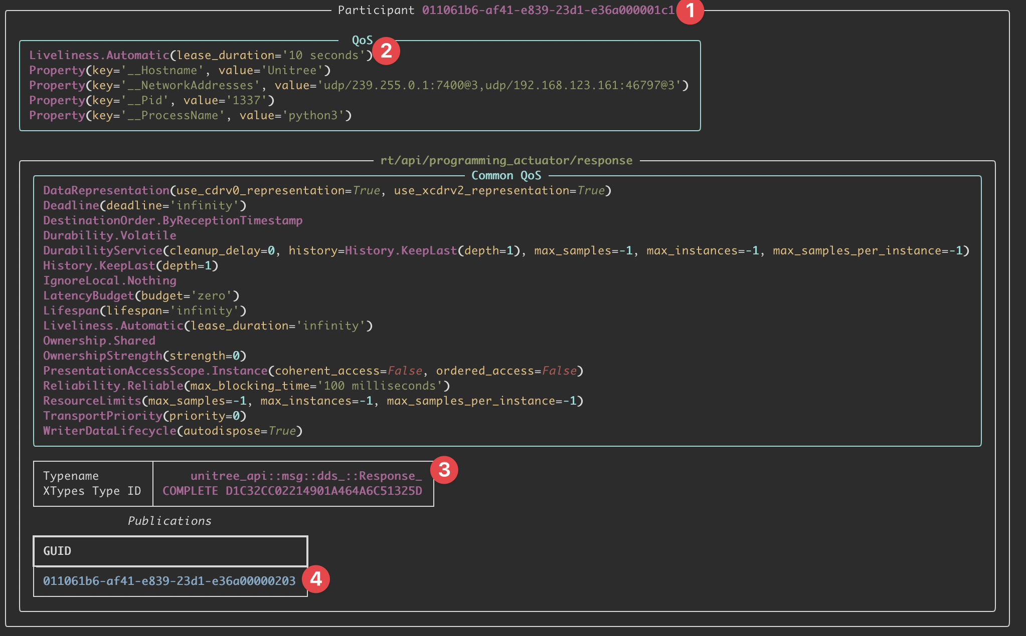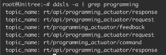 Using the cyclonedds ps -t "rt/programming_actuator/" on the robot, we can inspect the DDS participants and topics related to the programming actuator service. This command displays the participant information, Quality of Service (QoS) settings, topic details, and publication information for any topics matching the specified filter.