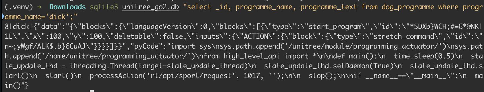 sqlite3 unitree_go2.db "SELECT json_extract(programme_text, '$.pyCode') FROM dog_programme WHERE programme_name='olivier';"
