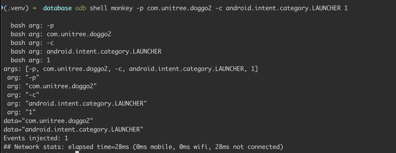 adb shell rm /sdcard/unitree_go2.dbYou can verify the app works by running adb shell monkey -p com.unitree.doggo2 -c android.intent.category.LAUNCHER 1 and you can run adb shell pidof com.unitree.doggo2 to obtain the PID of the running app.