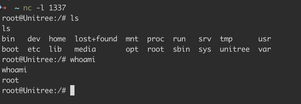 We didn't start from scratch. RoboVerse is an active community focused on developing and reversing Unitree robots. We used their V1.1.7 jailbreak and legion1581โs recovery script to flash the firmware onto our Go2. This version lets us gain SSH access using the UniPwn exploits, giving us a root shell so we can begin analyzing and reversing our Go2.