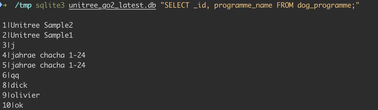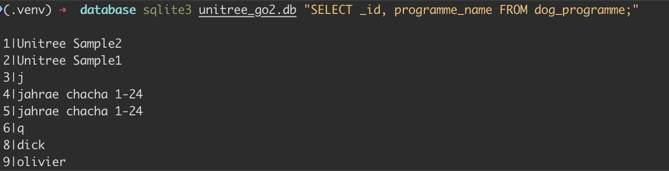 sqlite3 unitree_go2.db "SELECT _id, programme_name FROM dog_programme;"