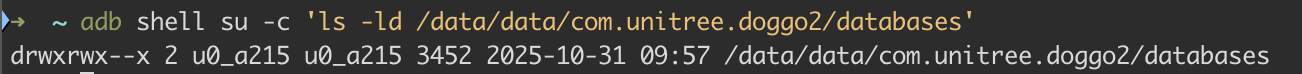 adb shell su -c 'chown u0_a215:u0_a215 /data/data/com.unitree.doggo2/databases/unitree_go2.db'
