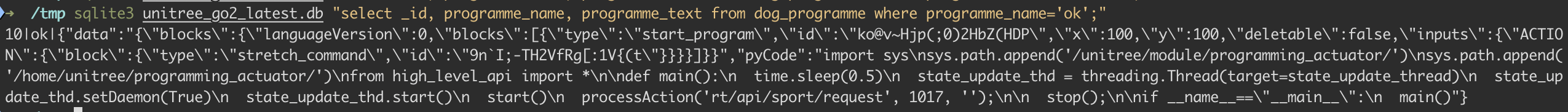 After running the script, check the contents of that table. sqlite3 unitree_go2.db "select _id, programme_name, programme_text from dog_programme where programme_name='olivier';"