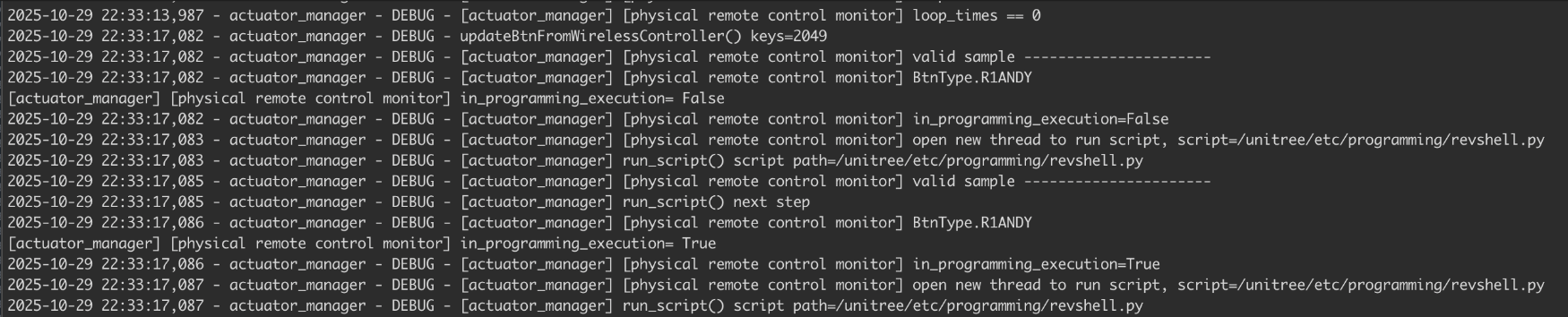 - November 03, 2025 โ Submitted evidence for the V1.1.11 RCE to Unitree, including a demo video and POC code to assist with validating V1.1.7.