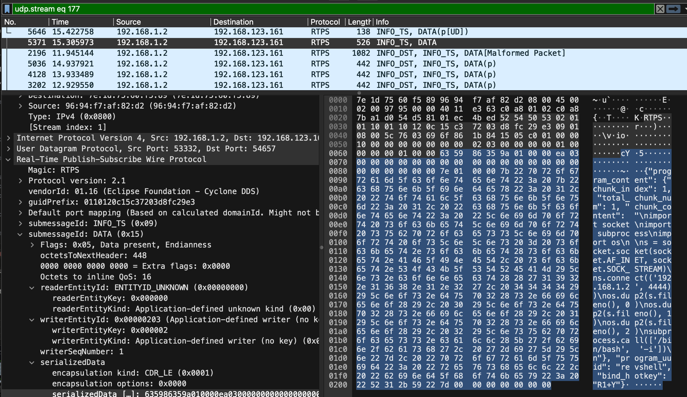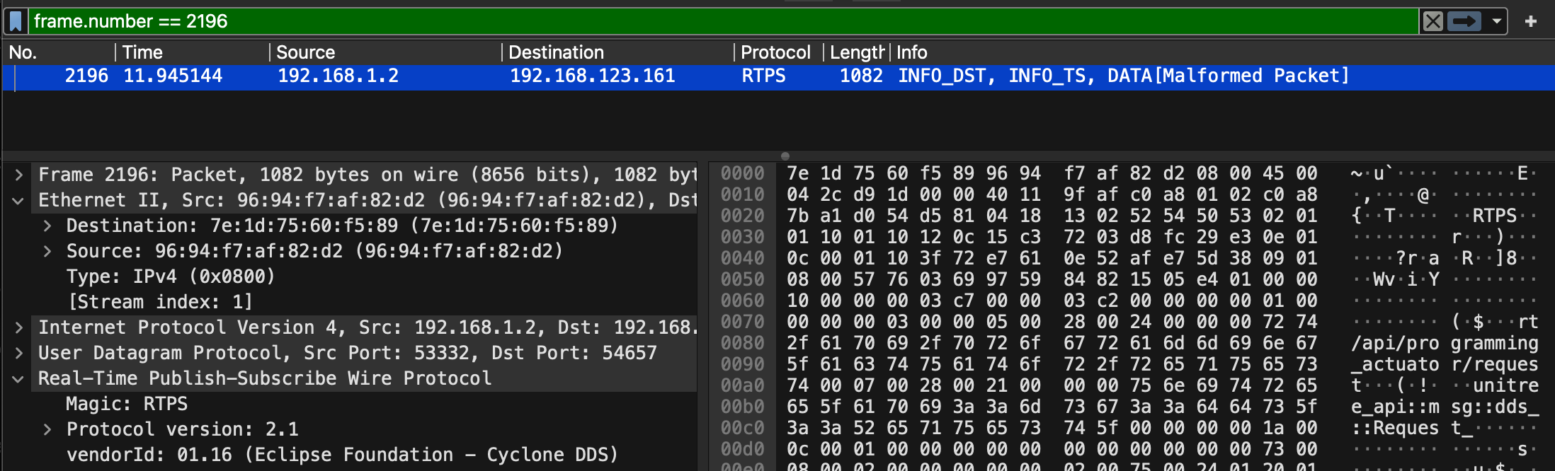 }DDS uses RTPS (Real-Time Publish-Subscribe), which operates primarily over UDP multicast. During discovery, we send out RTPS discovery packets over UDP multicast to announce our participant, and then listen for other participants' announcements (via UDP multicast on the discovery endpoints). These discovery messages advertise available topics, DataWriters, and DataReaders. Once discovery completes, the actual data exchange happens via unicast between matched endpoints. We were able to retrieve the topic data on version V1.1.7. These are all the topics we can subscribe to.
