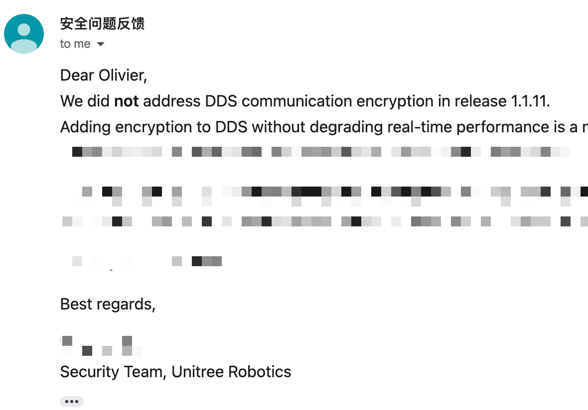 Unitree is clearly working to rebuild trust with the security community after the Unipwn incident. They have since gone live with their Security Response Center. Despite being stretched extremely thin (they need more dedicated security headcount IMHO), their teams always responded promptly and respected our work as security researchers. Notably, "Ixonz" from their security team deserves a special shoutout for going above and beyond, being responsive, & professional throughout disclosure.