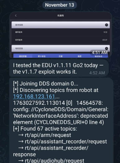 - November 10, 2025 โ The Unitree security team validated & reproduced the DDS exploit on versions V1.1.7-V1.1.11 EDU.